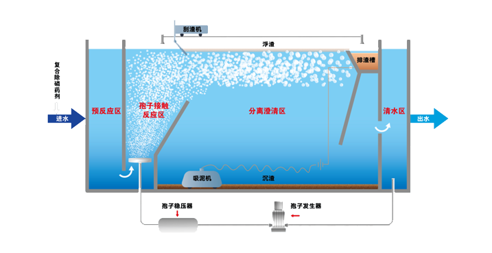 孢子轉移技術,是將混凝技術、氣浮技術與微納米孢子相結合,通過定制化藥劑、微納米氣泡與水中的磷、疏水基懸浮物發(fā)生反應,創(chuàng)新形成的一種高效物理化學處理方法。主要解決了目前常用溶氣氣浮技術在應用過程中存在的處理效率較差、表面負荷較低、處理能耗較高、應急機動性不強等問題。